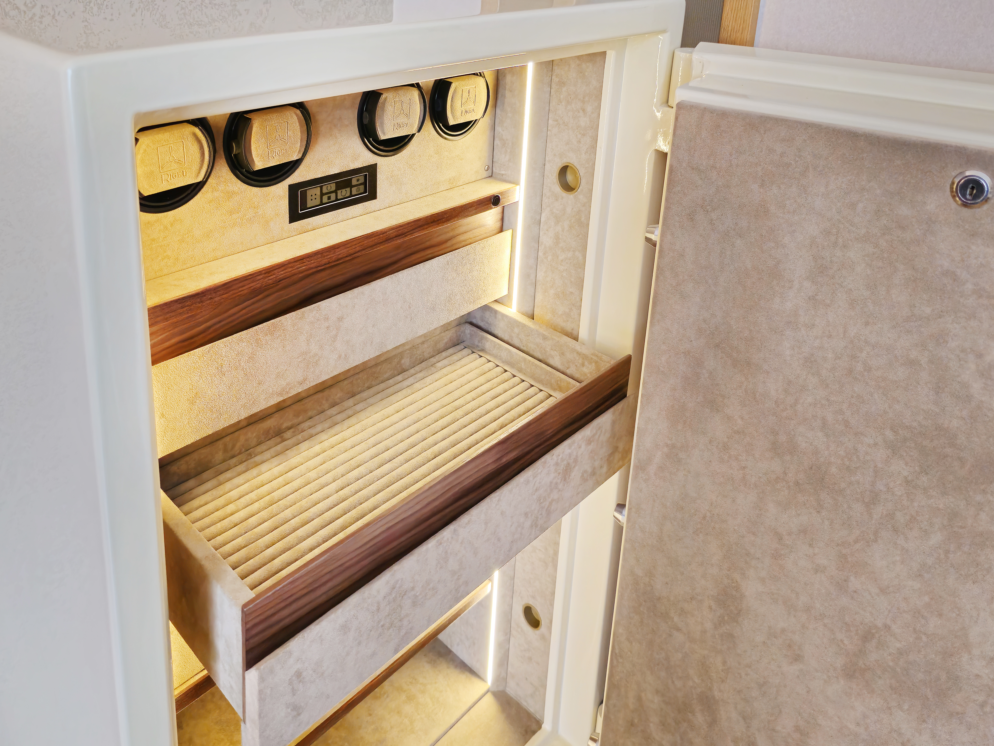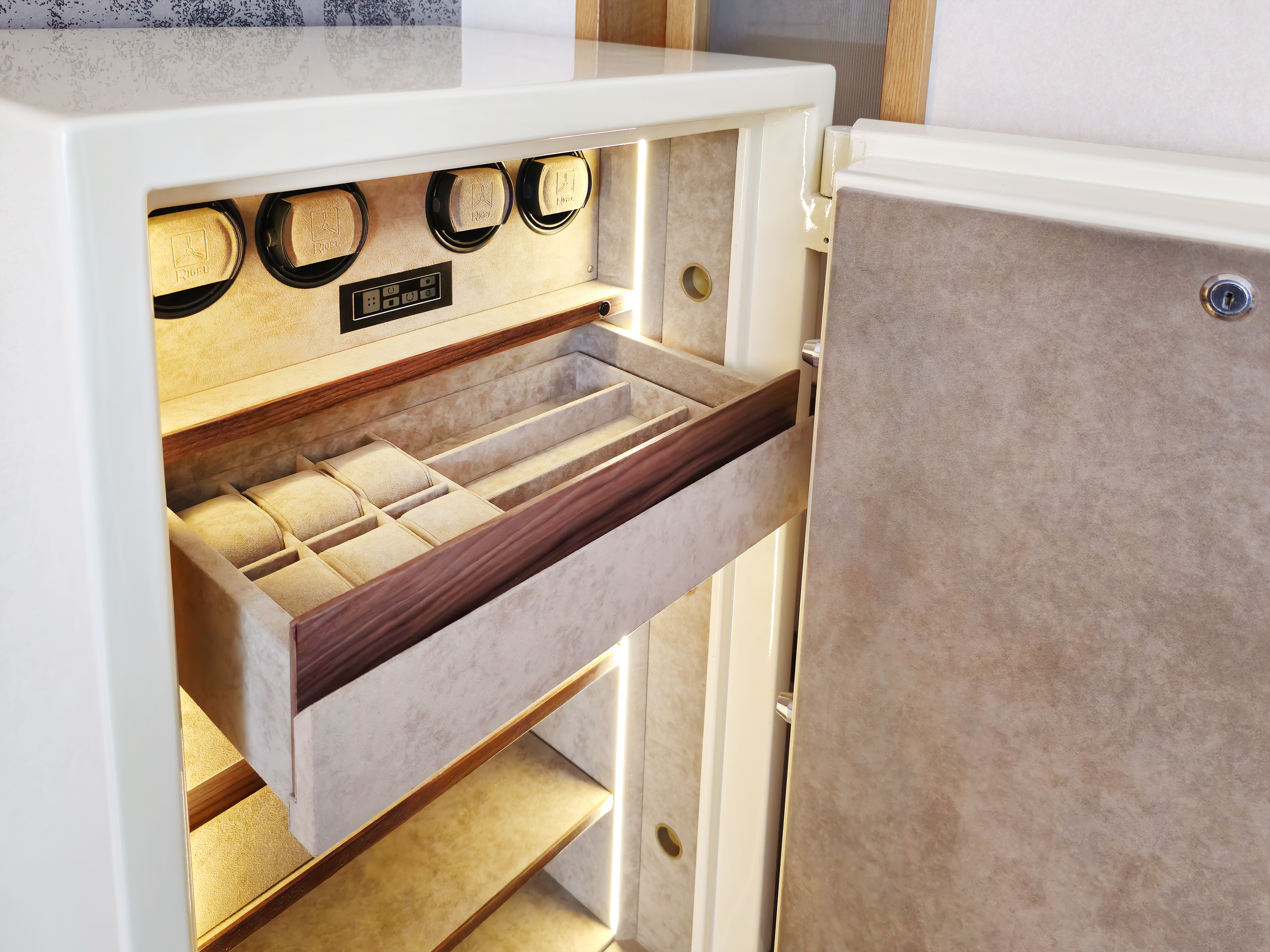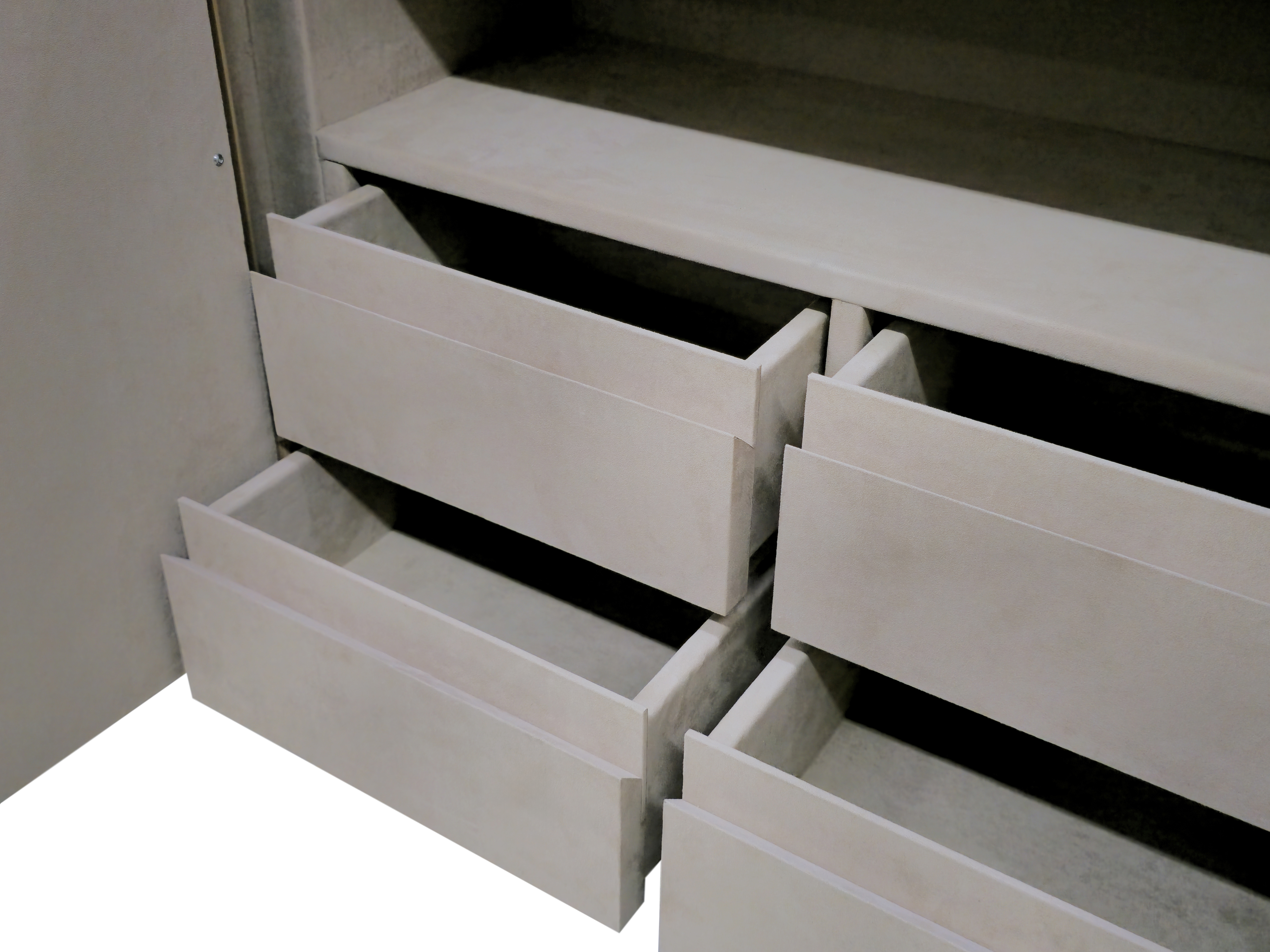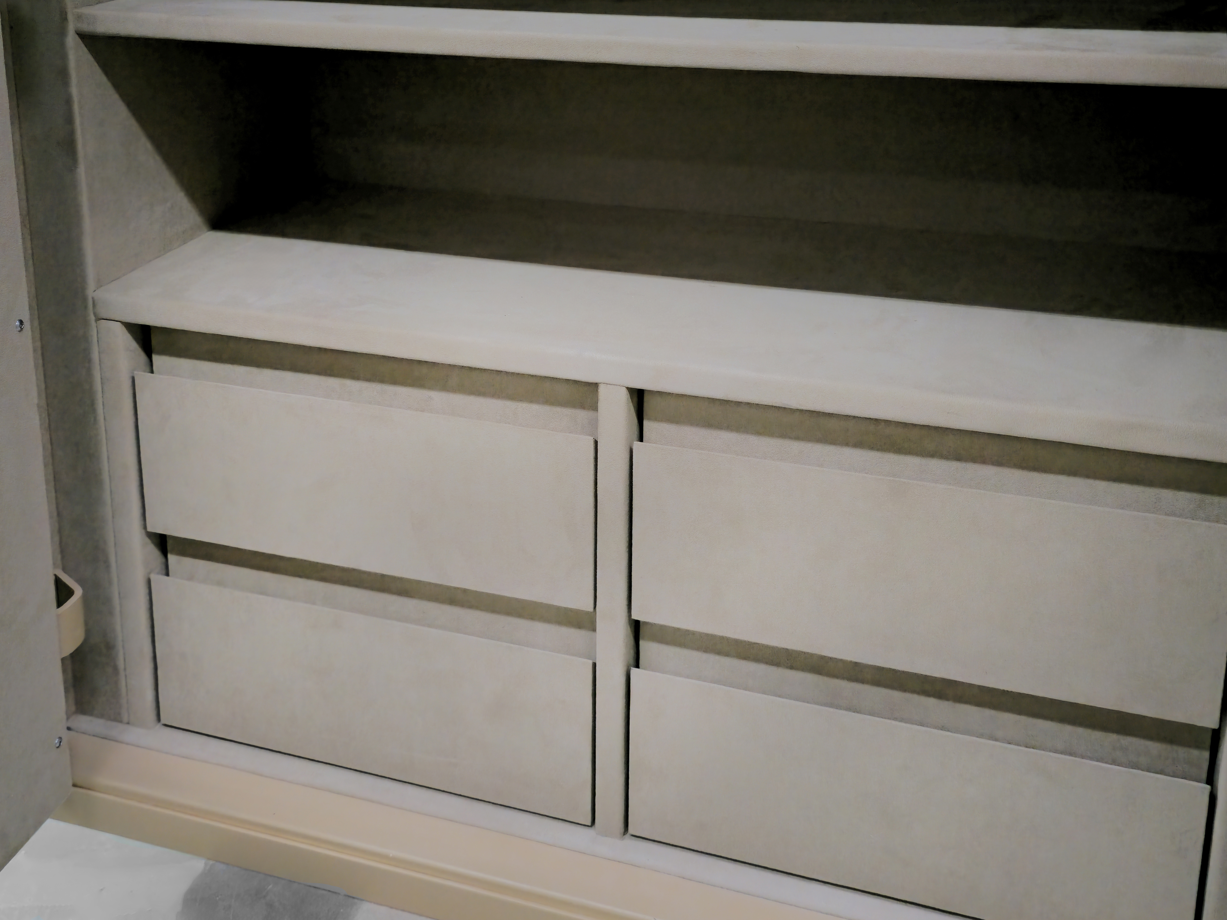 Так же изготовлена тумба с ящиками для удобного использования сейфа. В каждом ящике дно из алькантары