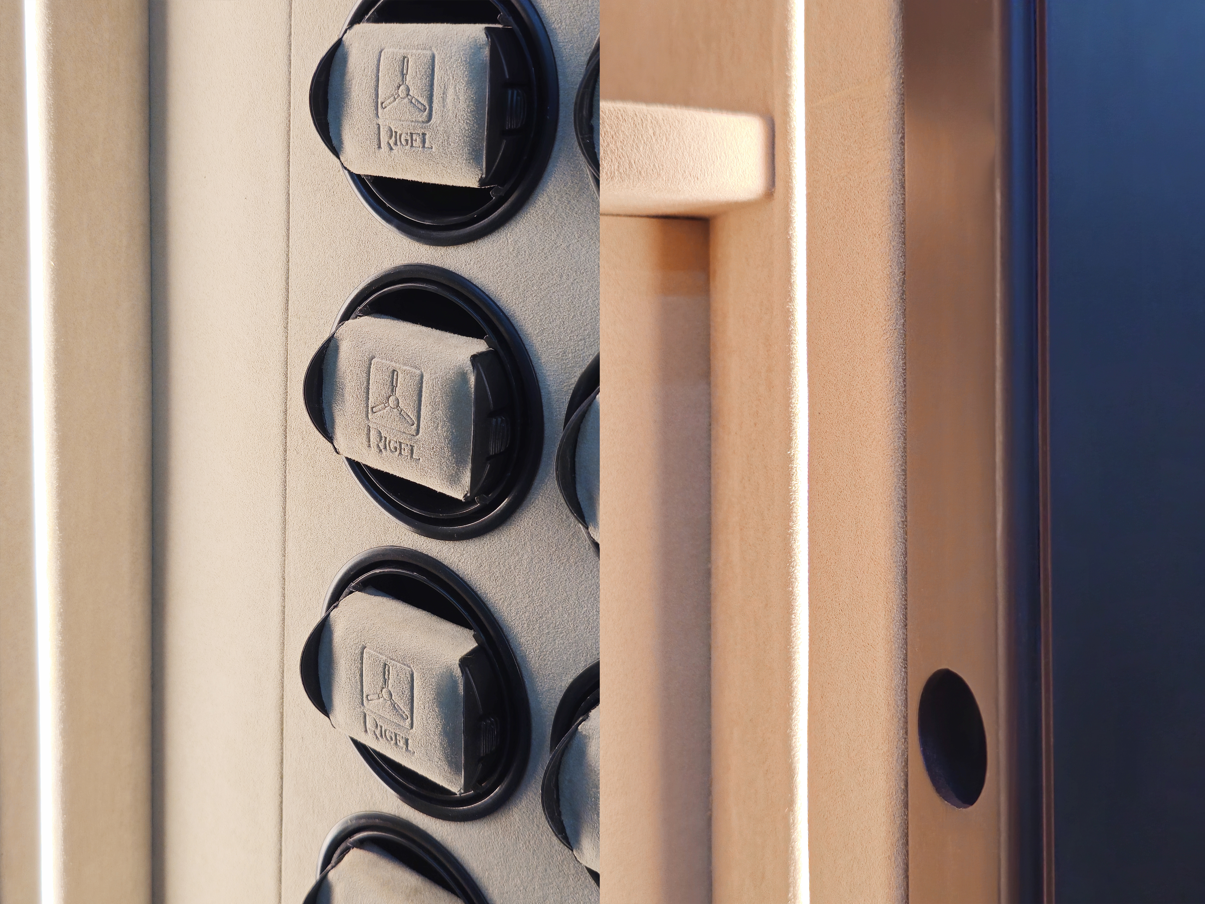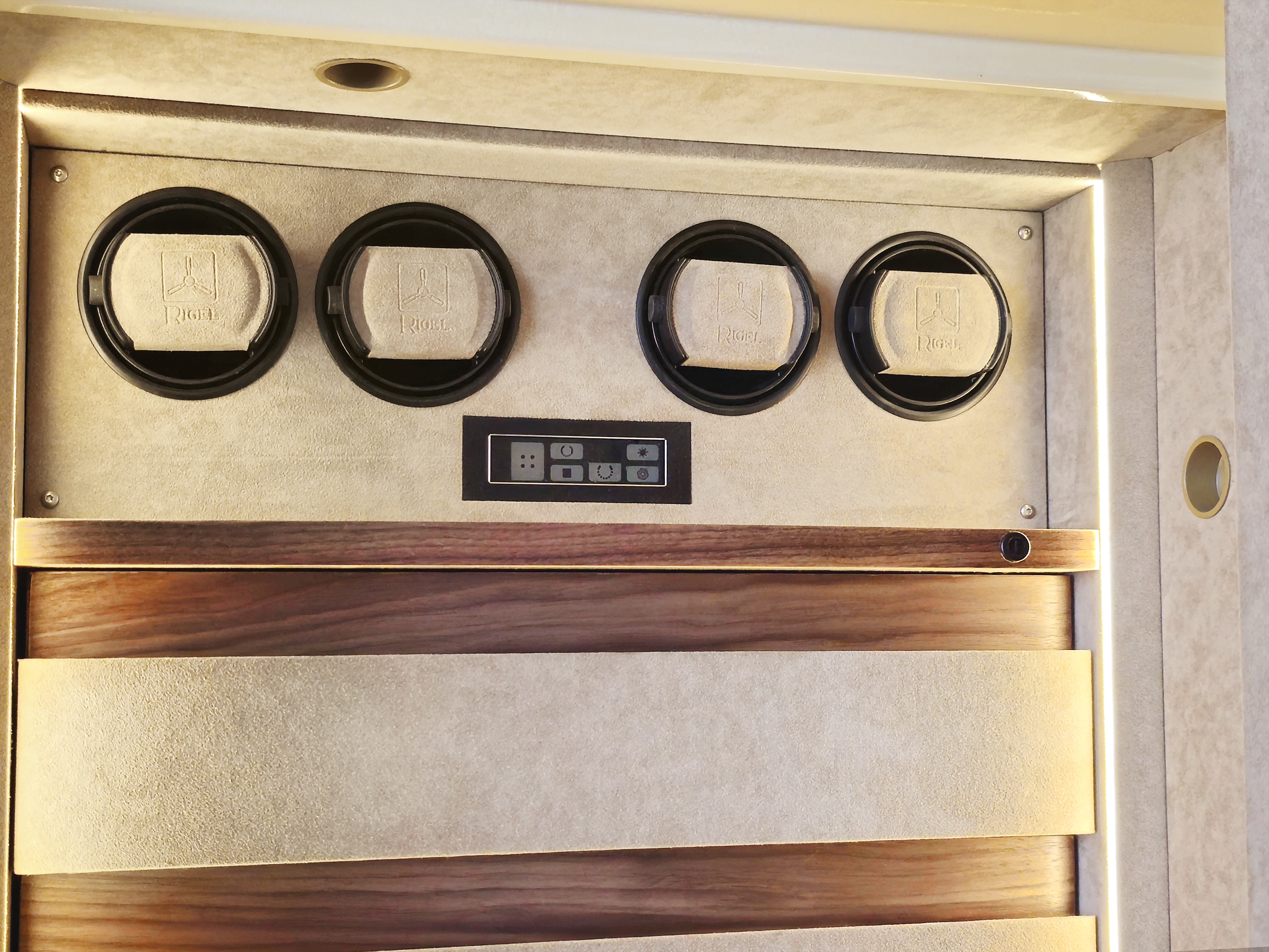 Трейзер: в правом отделении с отделкой внутри алькантарой , снаружи массивом и шпоном дуба