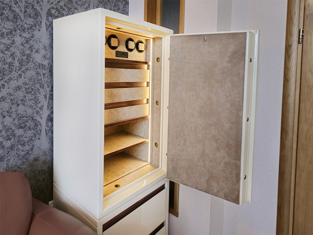 Наша компания является экспертом в области производства сейфов, и предлагает изготовление сейфов от 1 до 8 класса безопасности. Мы также предоставляем услуги по декорированию сейфов, чтобы они идеально сочетались с Вашим интерьером. В процессе работы мы используем разнообразные виды шпона, массива, алькантары, ткани, и так же осуществляем покраску с глянцевым покрытием по автомобильной технологии. Кроме того, мы интегрируем автоматические системы для часов и создаём эргономичное пространства внутри сейфа для хранения Ваших ценностей.